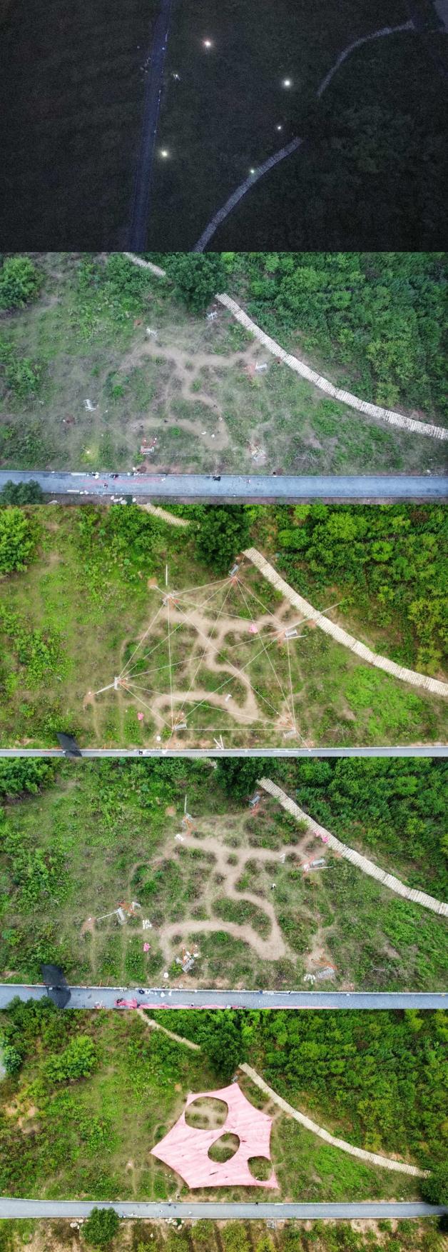 The one-month design workshop ended successfully!From almost regretting participating to regretting almost missing out!Our design starts from the discussion of daily life, excavates the materials and structures used in the site, combines the concept of circular construction, and explores the adaptive structure and the sustainable building design method in the site.Key words: Crazy, Dynamic, High-intensityCrazy: Just 12 students and 4 teachers built a device of more than 750 square meters in 5 days!Dynamic: Huge pavilions like red rivers, undulating in the valley.The building is completed by low-tech construction methods, the components are minimally processed, there is no accurate data, the construction process is designed while doing, changes continue to the last moment of completion.High-intensity: It took four weeks to complete the process from site analysis and conceptual design to structural study and construction.This work camp was the first time for me to participate in the whole process from design to construction. For me personally, it was not only the training of construction, but also the challenge of coordinating the needs of all parties.Thank you very much for the assistance of Xiangtang, the guidance of teachers, the cooperation and tolerance of partners, the participation of volunteers, and Prof. Hu's recommendation!!