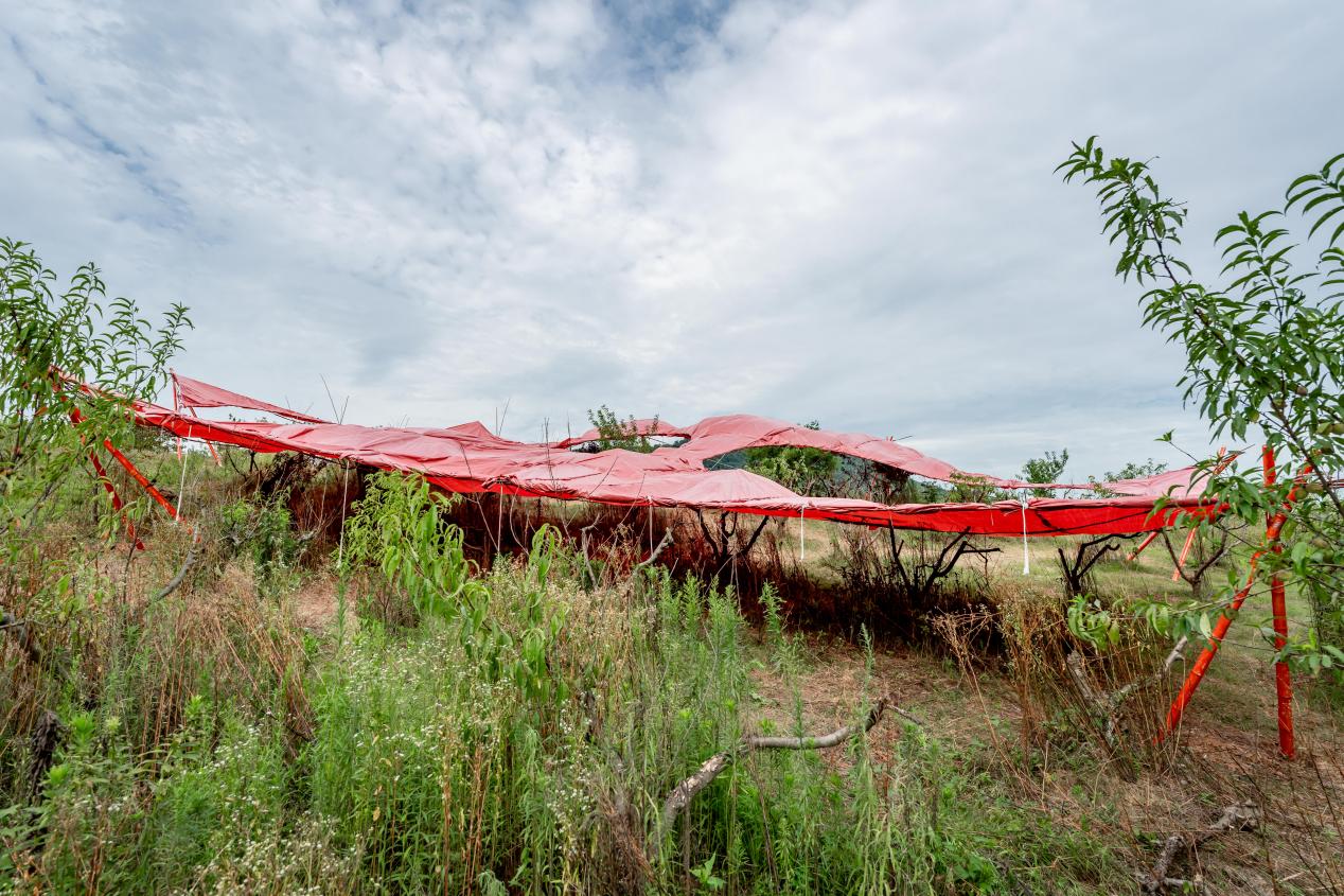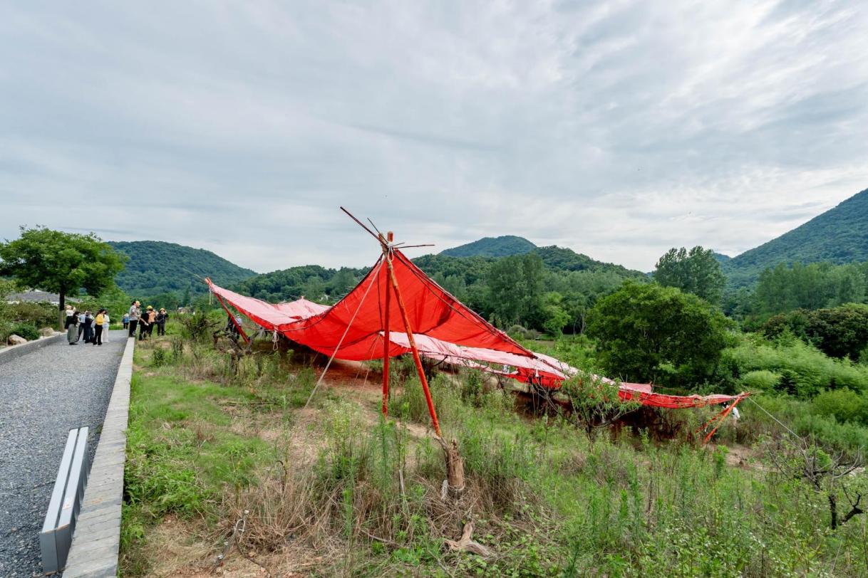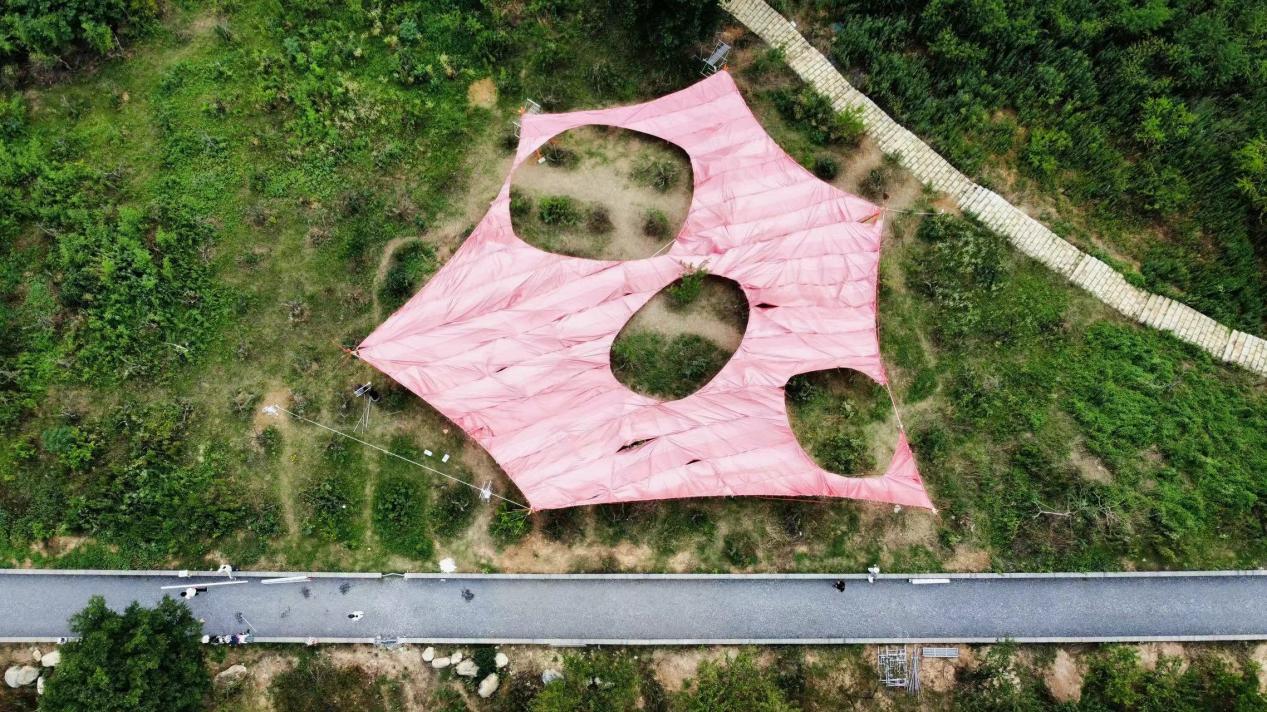 Red Canopy is located on the northern slope of Xiangtang in Pukou, Nanjing. It is an enormous floating structure made of bamboo of varying thickness and woven fabric, aiming to respond to the natural, historical, and social environment of Xiangtang on a topographical scale. Covering an area of 750 square meters, the pavilion, with its exceptional size, form, and color, adds a distinctive character to the silent site, revealing the yet undiscovered poetry of the slope.