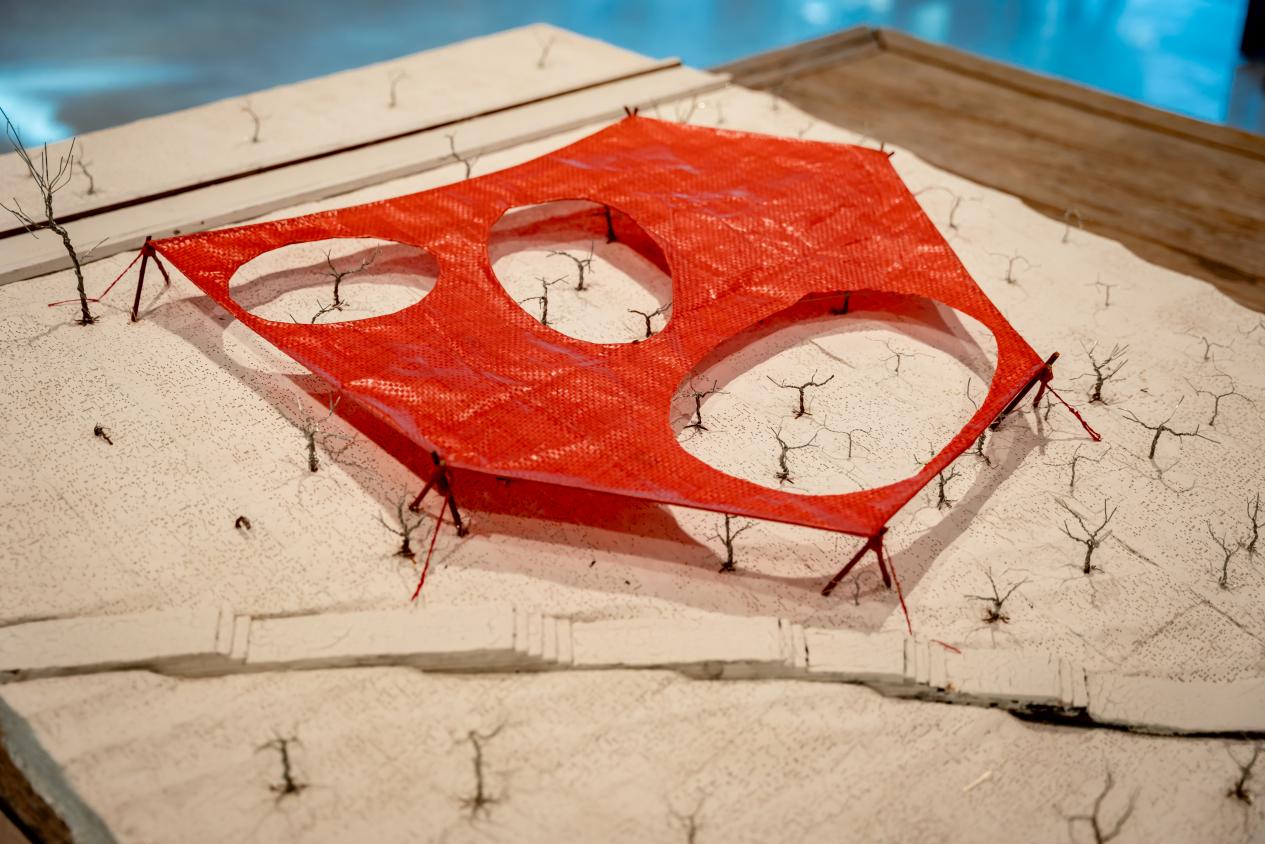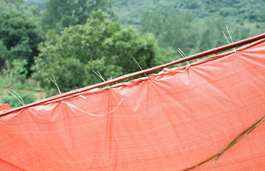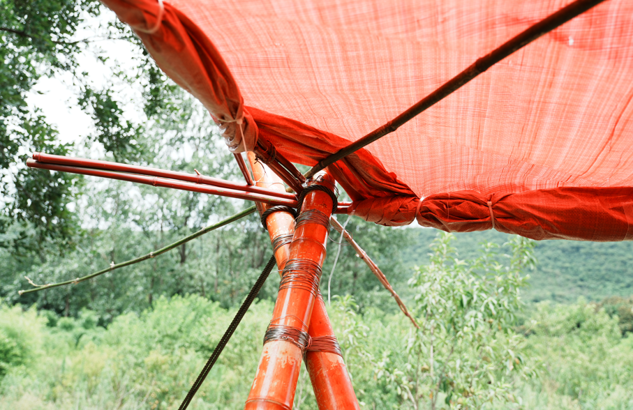 Red Canopy combines the ordinary with the concept of circular construction, exploring a sustainable architectural design method that is locally rooted. The main components of the building come from easily accessible local materials, assembled using low-tech construction techniques commonly used in the village. The thin bamboo strips forming the ribs were harvested nearby with the help of local villagers, and the woven fabric is a cheap polypropylene material commonly used for wind and rain protection in this area. This practicality-oriented hybrid approach creates a new ordinariness between temporary and permanent, natural and artificial, local and global. All components are minimally processed to retain maximum reuse potential, allowing them to be returned to the villagers for different everyday uses in the future