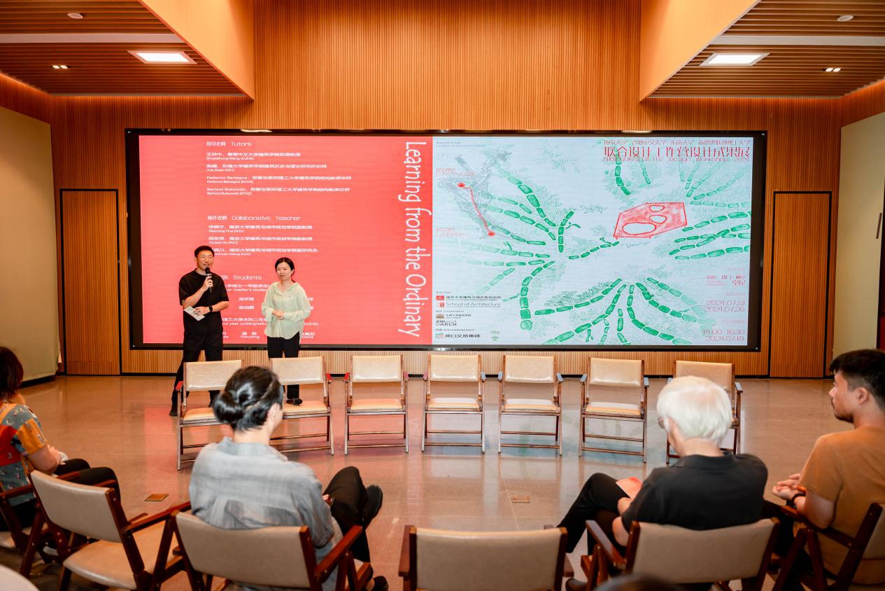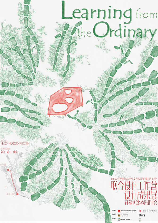 The "Learning from the Ordinary" design workshop, jointly directed by Nanjing University, the Chinese University of Hong Kong, Southeast University and ETH Zurich, Switzerland, was officially launched on June 24, 2024, and ended successfully on July 19, 2024.This workshop aims to combine the elements of everyday life with the concept of circular construction and explore a sustainable building design method in the ground.This joint design workshop is also part of the 2024 "Rural Revitalization Workshop in Suzhou, Hong Kong and Macau" initiated and hosted by the School of Architecture and Urban Planning, Nanjing University.During the four-week workshop, four tutors worked with 12 students from the Department of Architecture of Nanjing University and the Chinese University of Hong Kong on the design and construction of a space installation in Xiangtang Village, Nanjing.After 15 days of analysis and design and 5 days of on-site construction, the final result of the workshop, A Pavilion, was completed on the slope of the north side of Xiangtang Village.On July 19, a number of professors and experts conducted an academic discussion on this achievement.The results of the workshop will be exhibited until July 26.